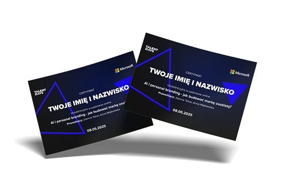 Wydarzenie odbyło sięDołącz do bezpłatnych warsztatów Talent Class o wykorzystaniu AI, które odbędą się podczas najbliższych wydarzeń karierowych Talent Days. Zapisz się, porozmawiaj na żywo z ekspertami Microsoft i zdobądź imienny certyfikat!